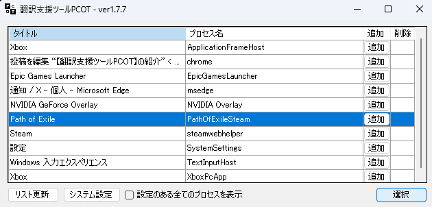 ※PCOTを先に起動、ゲームを後から起動した際は右下の「リスト更新」をクリックすればゲームが表示されます。