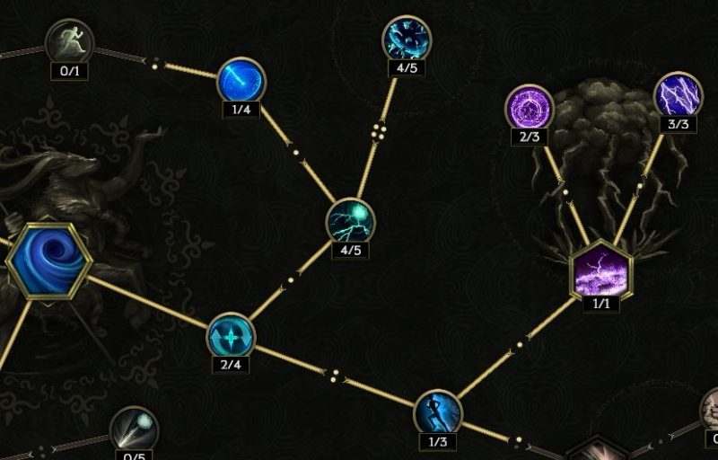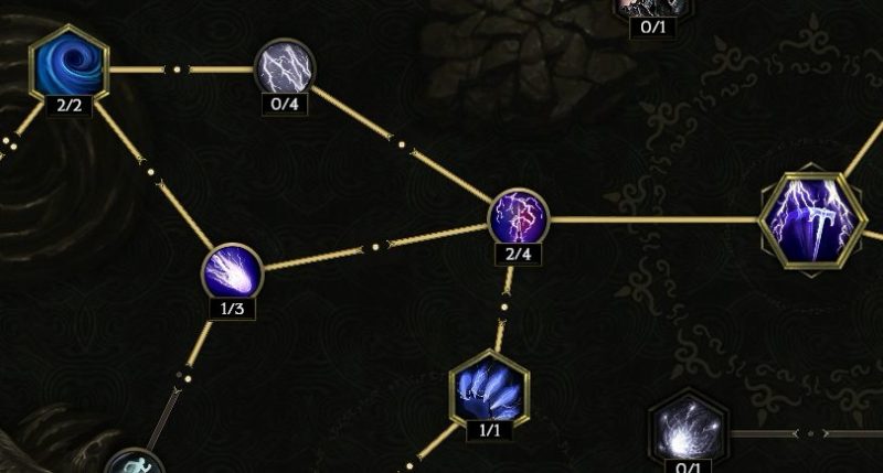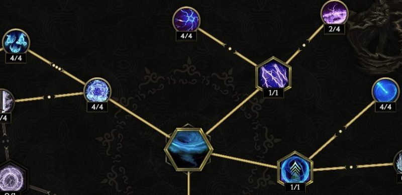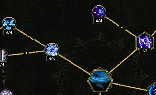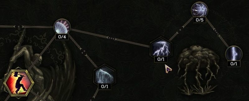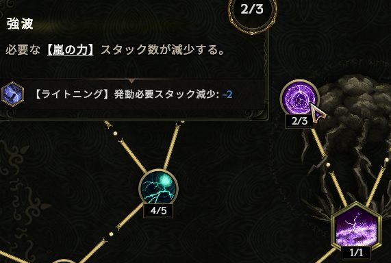 真上の【ストームボルト】トリガーを取る。そのまま左上の発動頻度上昇を取ってもいいし、左側に進んでダブル竜巻を取ってもいい。左上が優先か。