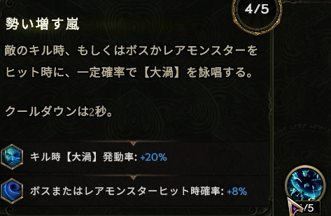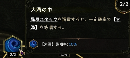 【雄叫び】のトリガーで【大渦】が4貯まる。ストームボルトを発動させるにはあと2を手動詠唱するか、【強波】でスタック数を減らす